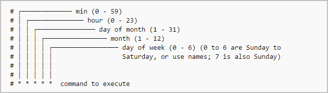 Det är en fördel att ha en bra generell förståelse för cron innan vi dyker ner i exemplet. Nedan är en kortfattad översikt över cron-kommandot och hur det fungerar (hoppa över det här steget). Här är ett enkelt cron-exempel: